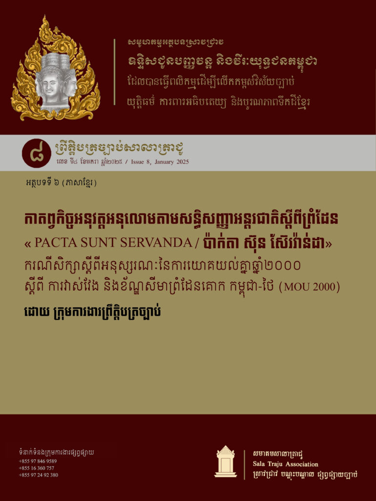 របៀបយោងអត្ថបទ៖ ក្រុមការងារព្រឹត្តិបត្រច្បាប់, កាតព្វកិច្ចអនុវត្តអនុលោមតាមសន្ធិសញ្ញាអន្តរជាតិស្តីពីព្រំដែន «PACTA SUNT SERVANDA / ប៉ាក់តា ស៊ុន ស៊ែរវ៉ាន់ដា» ករណីសិក្សាស្តីពីអនុស្សរណៈនៃការយោគយល់គ្នាឆ្នាំ២០០០ ស្តីពីការវាស់វែង និងខ័ណ្ឌសីមាព្រំដែនគោក កម្ពុជា-ថៃ (MOU 2000), ព្រឹត្តិបត្រច្បាប់សាលាត្រាជូលេខពិសេស ទី៨ សមូហកម្មអត្ថបទស្រាវជ្រាវឧទ្ទិសជូនបញ្ញវន្ត និងវីរៈយុទ្ធជនកម្ពុជា ដែលបានធ្វើពលិកម្មដើម្បីលើកកម្ពស់វិស័យច្បាប់ យុត្តិធម៌ ការពារអធិបតេយ្យ និងបូរណភាពទឹកដីខ្មែរ, ភ្នំពេញ, ខែមករា ឆ្នាំ២០២៥។ PDF
