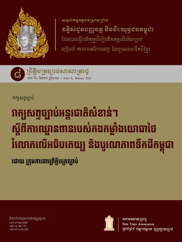 សមាគមសាលាត្រាជូ មានកិត្ដិយសសូមនាំមកជូននូវវាក្យស័ព្ទច្បាប់អន្ដរជាតិសំខាន់ៗស្ដីពី «ការឈ្លានពានរបស់កងកម្លាំងយោធាថៃរំលោភលើអធិបតេយ្យ និងបូរណភាពទឹកដីកម្ពុជា»។ អត្ថបទនេះត្រូវបានតាក់តែងរៀបចំឡើងចាប់តាំងពីការចាប់ផ្ដើមនៃសង្គ្រាមឈ្លានពានពីកងកម្លាំងយោធាថៃ កាលពីថ្ងៃទី២៤ ខែកក្កដា ឆ្នាំ២០២៥ កន្លងមកនេះ។ ជាក់ស្ដែងស្ថិតក្នុងបរិបទនាពេលបច្ចុប្បន្ននេះ សកម្មភាពសង្គ្រាមឈ្លានពានរបស់កងកម្លាំងយោធាថៃដែលកំពុងធ្វើការបាញ់ប្រហារមកលើដែនអធិបតេយ្យរបស់កម្ពុជា គឺបាននិងកំពុងរំលោភបំពានយ៉ាងធ្ងន់ធ្ងរលើច្បាប់អន្ដរជាតិនានាជាច្រើន ជាពិសេសដូចដែលមានសរសេរនៅក្នុងអត្ថបទវាក្យស័ព្ទច្បាប់អន្ដរជាតិនេះ ដែលបានរៀបចំចងក្រងនៅក្នុងសៀវភៅព្រឹត្ដិបត្រច្បាប់សាលាត្រាជូ លេខទី៨ លេខពិសេស។